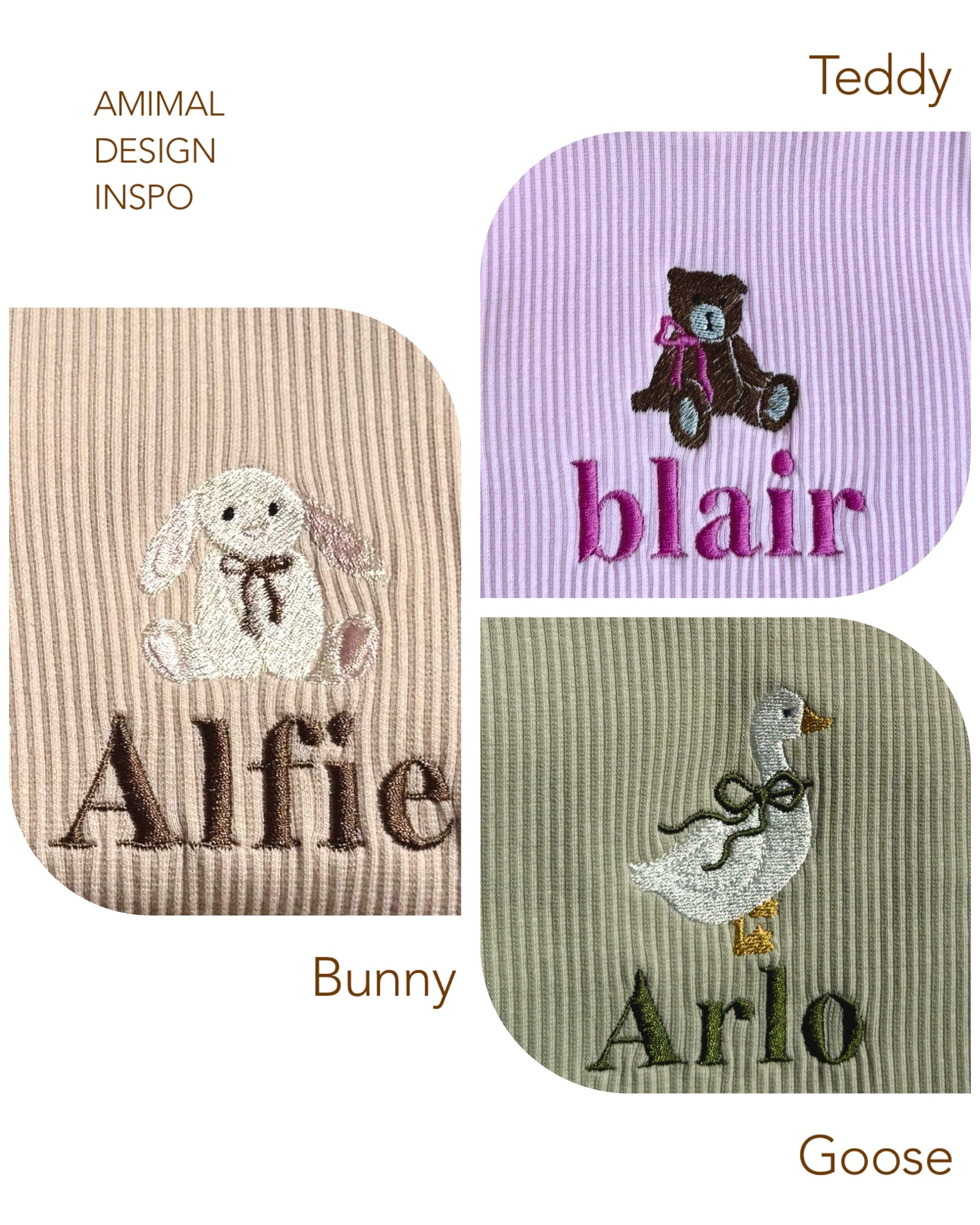 - Safari Animal Embroidery: Choose from fun designs like lion, unicorn, sheep, giraffe, or cow.